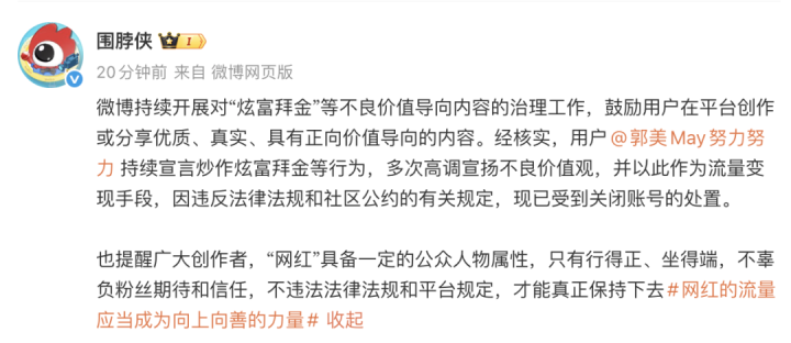 @围脖侠发文:微博持续开展对“炫富拜金”等不良价值导向内容的治理工作,鼓励用户在平台创作或分享优质、真实、具有正向价值导向的内容。经核实,用户@郭美May努力努力持续宣言炒作炫富拜金等行为,多次高调宣扬不良价值观,并以此作为流量变现手段,因违反法律法规和社区公约的有关规定,现已受到关闭账号的处置。